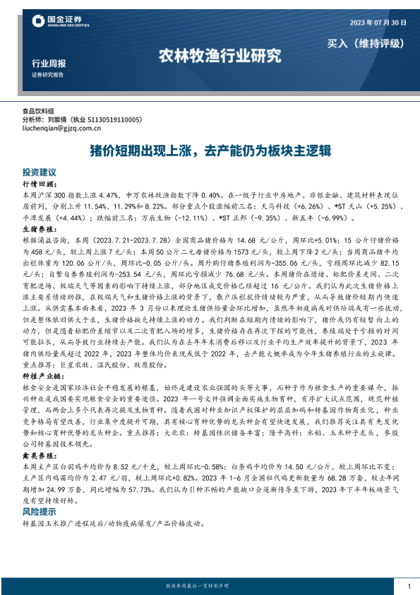 【国金证券】【20230730】20230730-国金证券-农林牧渔行业研究:猪价短期出现上涨,去产能仍为板块主逻辑-15页