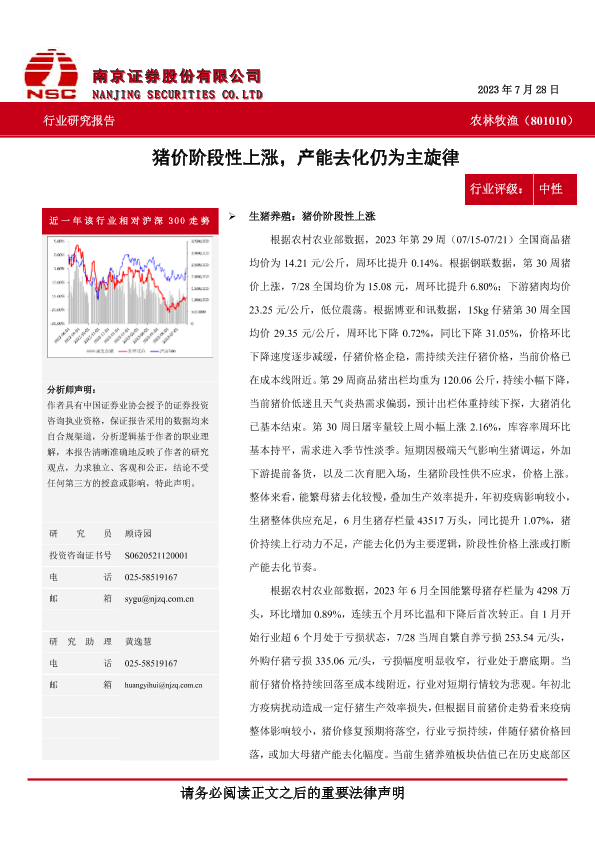 【南京证券】【20230728】20230728-南京证券-农林牧渔:猪价阶段性上涨,产能去化仍为主旋律-11页