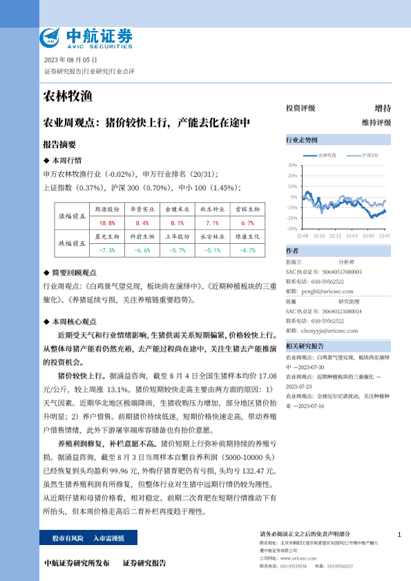 【中航证券】【20230805】农业周观点:猪价较快上行,产能去化在途中-13页