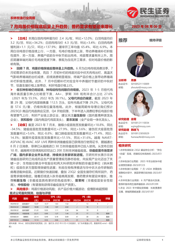 【民生证券】【20230806】20230806-民生证券-农林牧渔行业周报:7月鸡苗价格探底后呈上升趋势;兽药需求有望迎来增长-10页