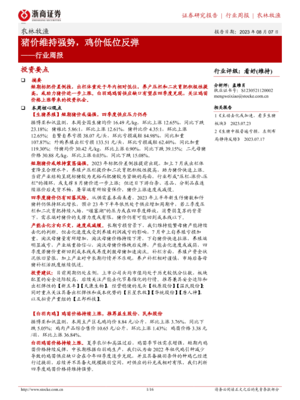 【浙商证券】【20230807】20230807-浙商证券-农林牧渔行业周报:猪价维持强势,鸡价低位反弹-16页