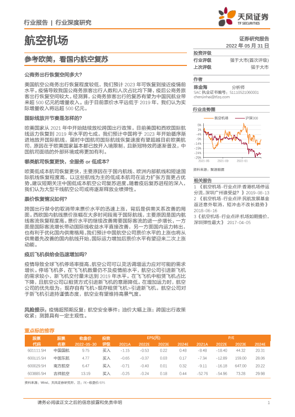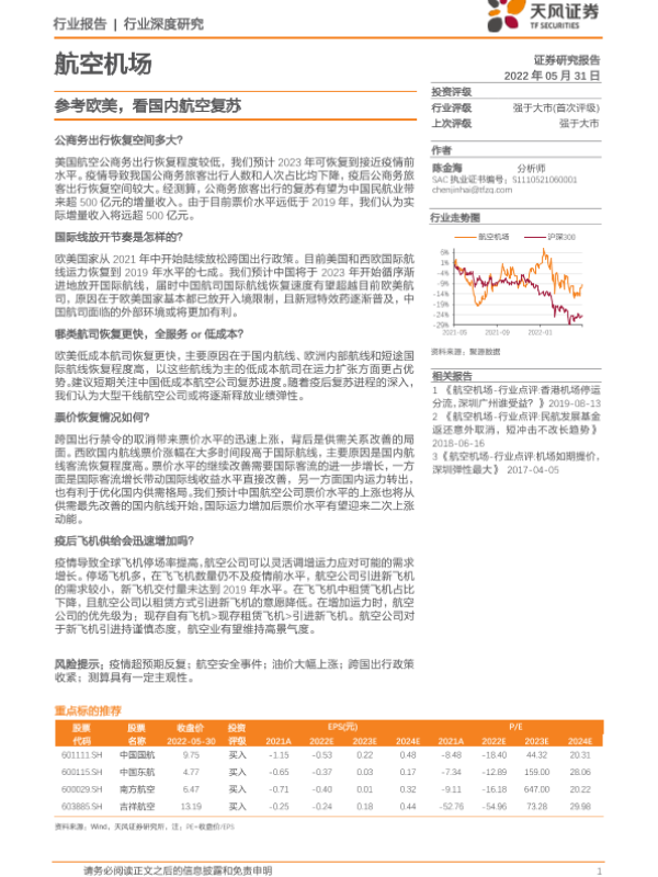 【天风证券】【20220531】航空机场行业:参考欧美,看国内航空复苏-17页