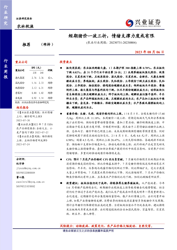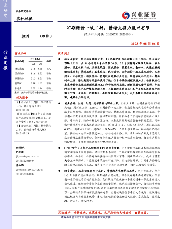 【兴业证券】【20230806】短期猪价一波三折,情绪支撑力度或有限-16页