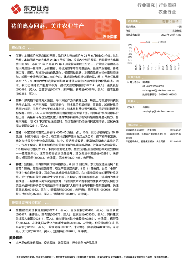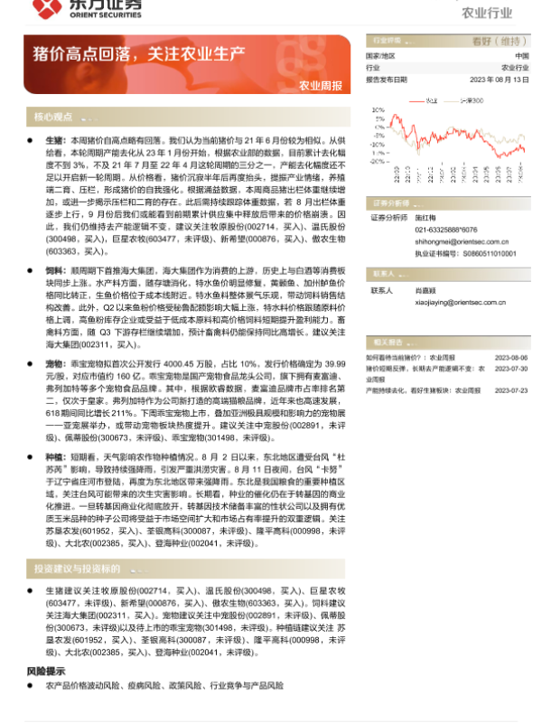 【东方证券】【20230813】20230813-东方证券-农业周报:猪价高点回落,关注农业生产-11页