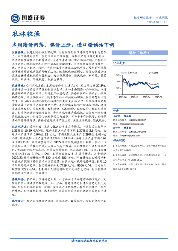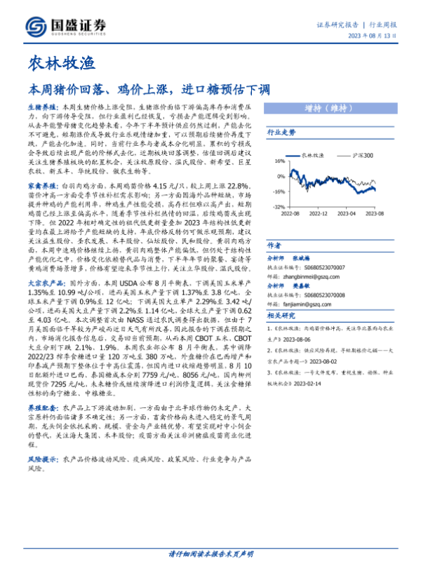 【国盛证券】【20230813】20230813-国盛证券-农林牧渔行业周报:本周猪价回落、鸡价上涨,进口糖预估下调-11页