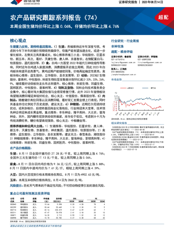 【国信证券】【20230814】20230814-国信证券-农产品研究跟踪系列报告(74):本周全国生猪均价环比上涨0.06%,仔猪均价环比上涨4.76%-23页