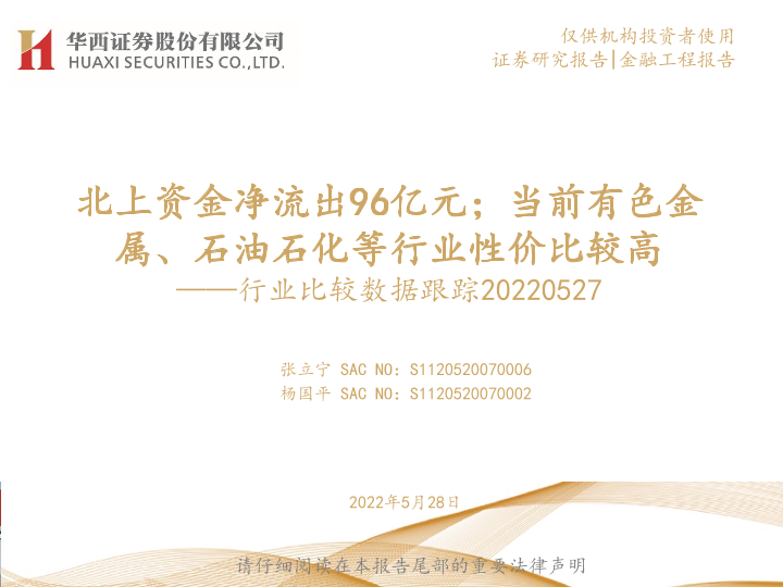 【华西证券】【20220528】行业比较数据跟踪:北上资金净流出96亿元;当前有色金属、石油石化等行业性价比较高-24页