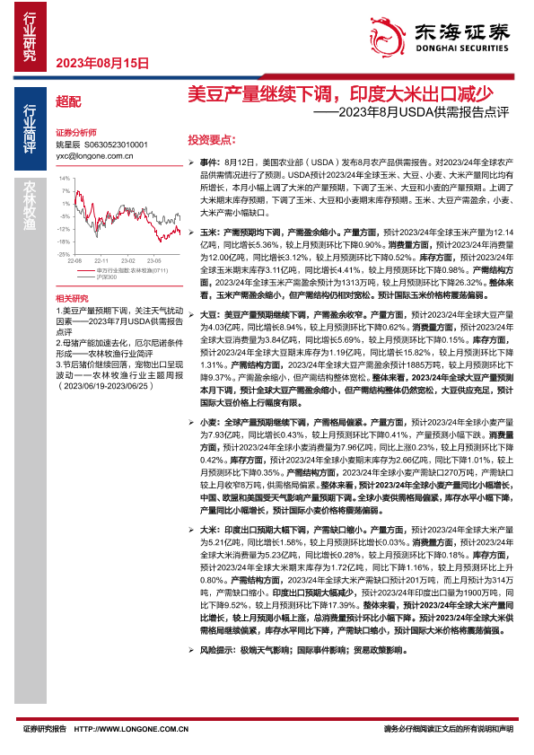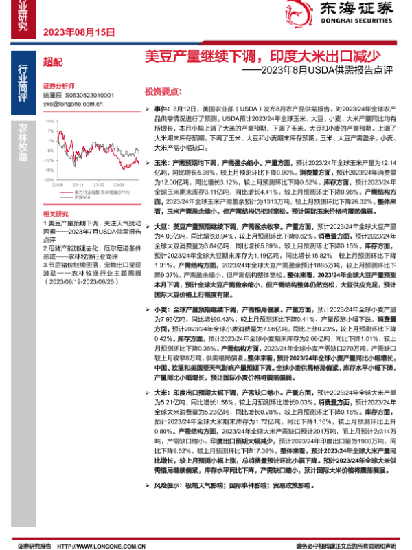 【东海证券】【20230815】2023年8月USDA供需报告点评:美豆产量继续下调,印度大米出口减少-10页