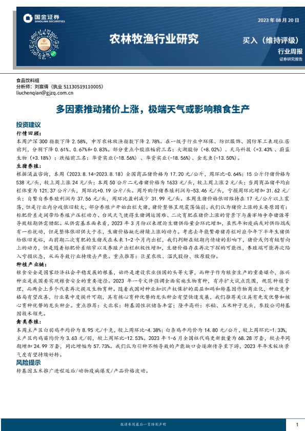 【国金证券】【20230820】20230820-国金证券-农林牧渔行业研究:多因素推动猪价上涨,极端天气或影响粮食生产-15页