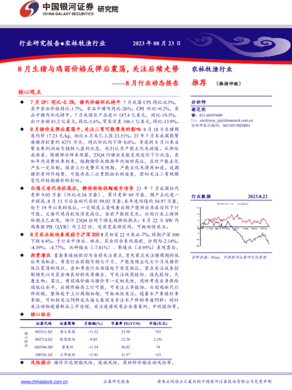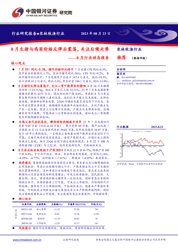 【银河证券】【20230823】20230823-中国银河-农林牧渔行业8月行业动态报告:8月生猪与鸡苗价格反弹后震荡,关注后续走势-22页