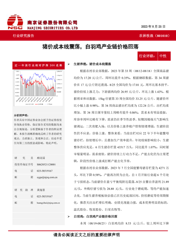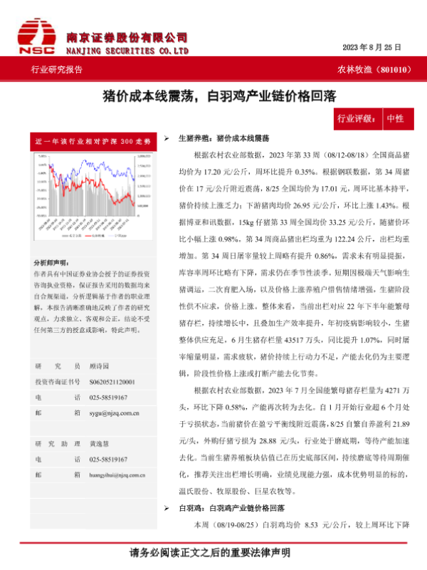 【南京证券】【20230825】20230825-南京证券-农林牧渔:猪价成本线震荡,白羽鸡产业链价格回落-10页