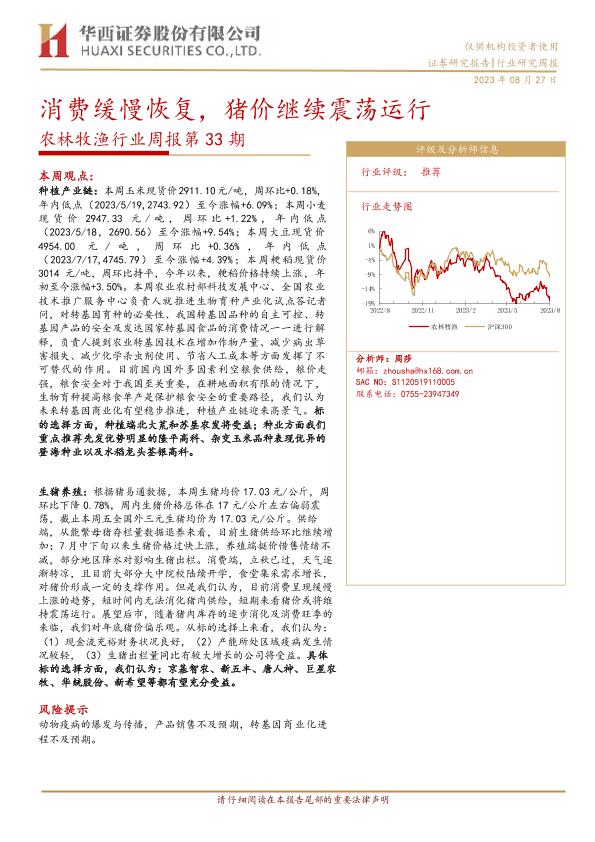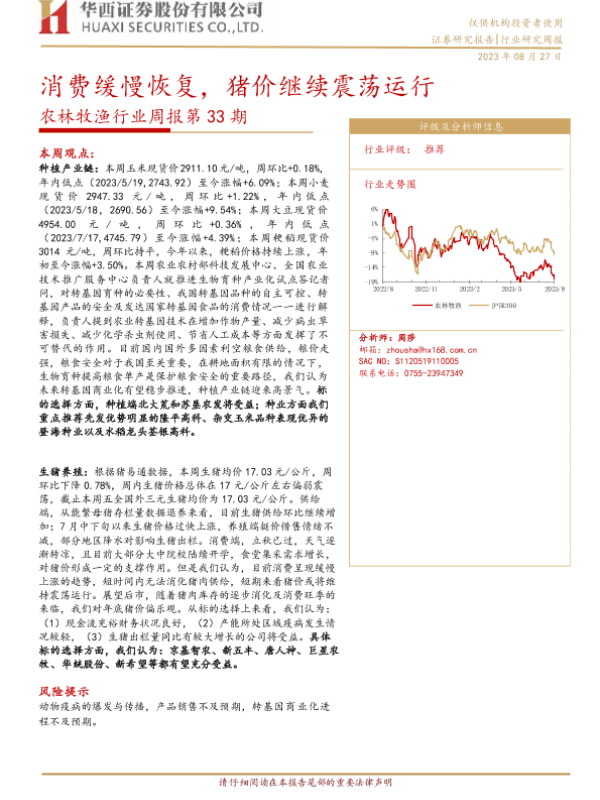 【华西证券】【20230827】20230827-华西证券-农林牧渔行业周报第33期:消费缓慢恢复,猪价继续震荡运行-25页