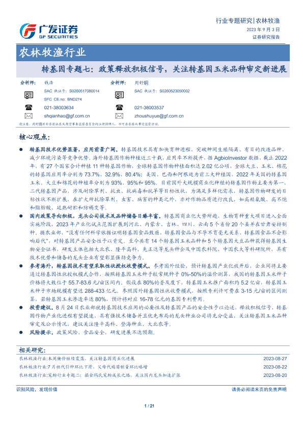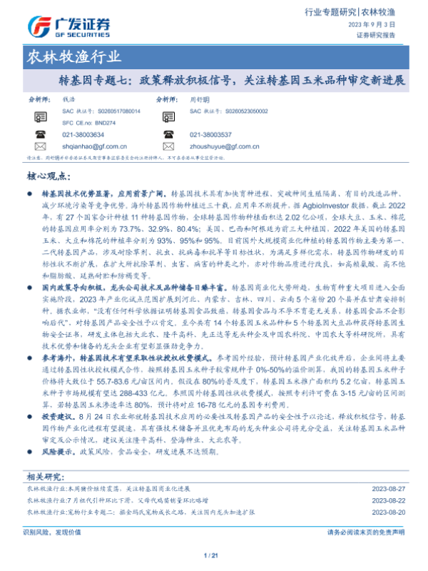 【广发证券】【20230903】农林牧渔行业:转基因专题七:政策释放积极信号,关注转基因玉米品种审定新进展-21页