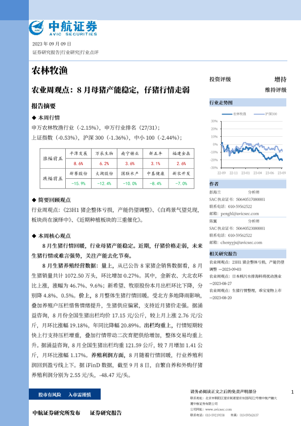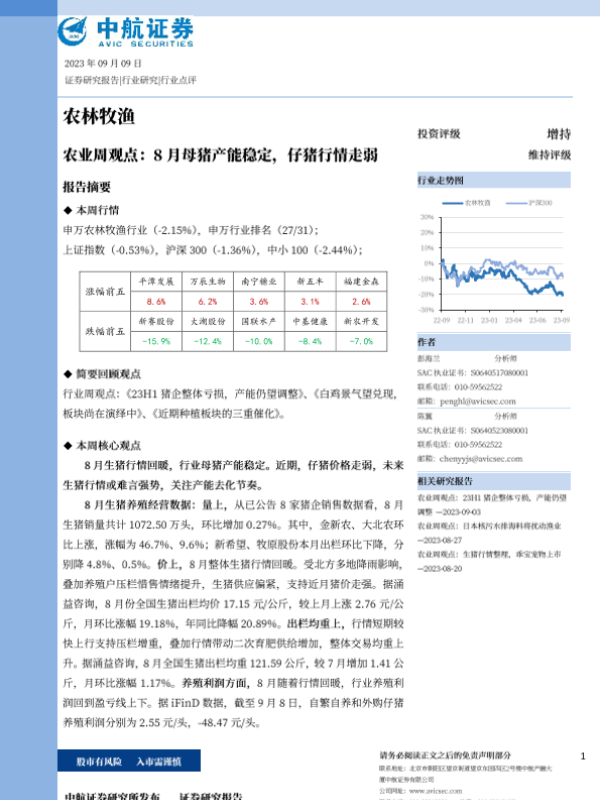 【中航证券】【20230909】农业周观点:8月母猪产能稳定,仔猪行情走弱-13页
