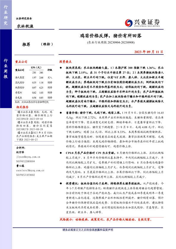 【兴业证券】【20230911】鸡苗价格反弹,猪价有所回落-16页