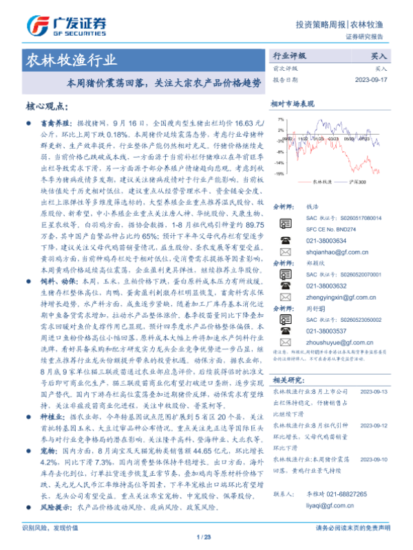 【广发证券】【20230917】20230917-广发证券-农林牧渔行业投资策略周报:本周猪价震荡回落,关注大宗农产品价格趋势-23页