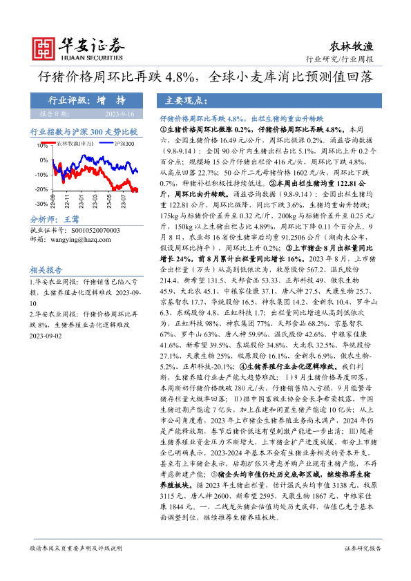 【华安证券】【20230916】20230916-华安证券-农林牧渔行业周报:仔猪价格周环比再跌4.8%,全球小麦库消比预测值回落-43页
