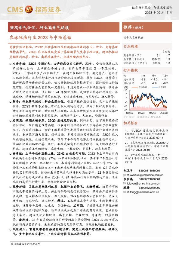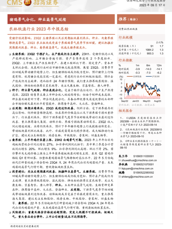 【海通证券】【20230917】农林牧渔行业2023年中报总结:猪鸡景气分化,种业高景气延续-23页