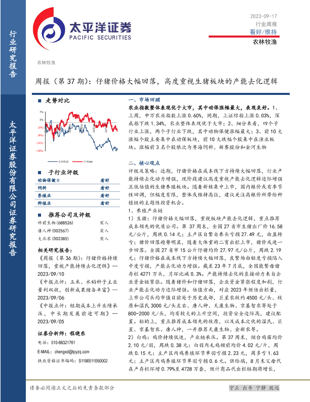 【太平洋证券】【20230917】20230917-太平洋-农林牧渔周报(第37期):仔猪价格大幅回落,高度重视生猪板块的产能去化逻辑-17页