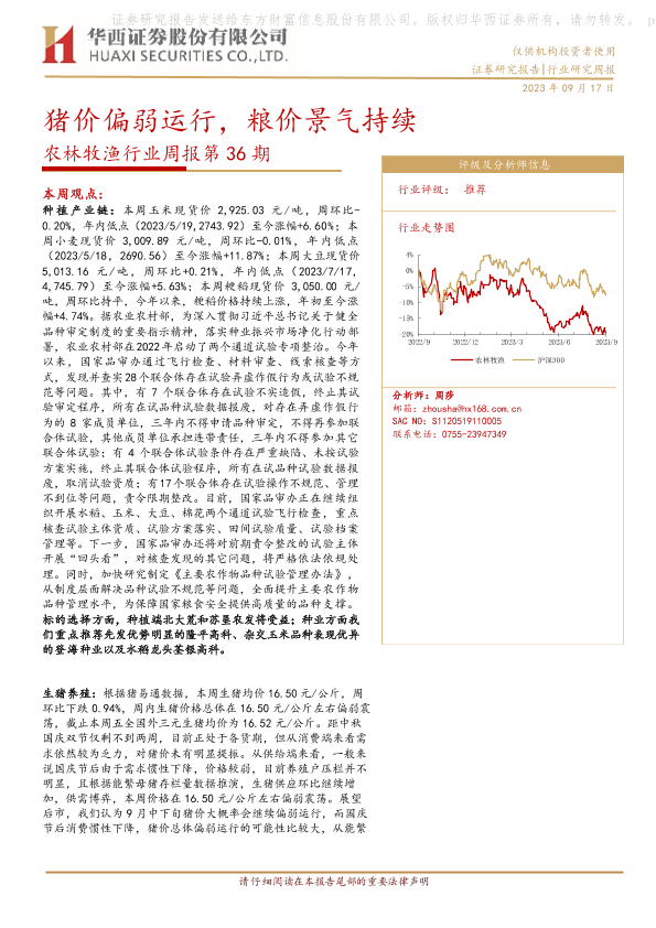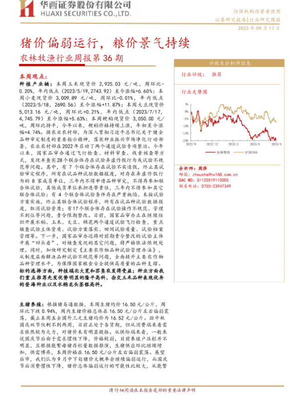 【华西证券】【20230917】农林牧渔行业周报第36期:猪价偏弱运行,粮价景气持续-25页