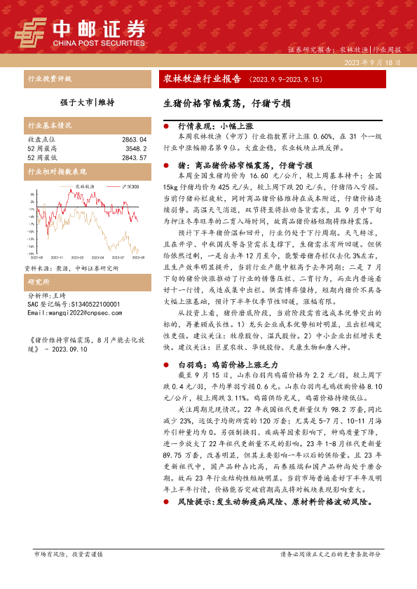 【中邮证券】【20230918】20230918-中邮证券-农林牧渔行业报告:生猪价格窄幅震荡,仔猪亏损-12页