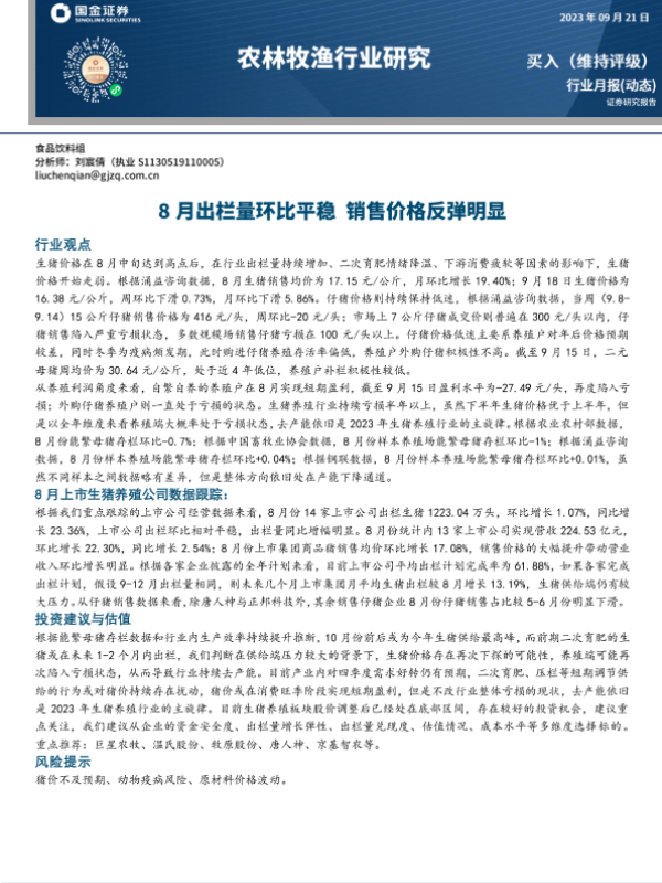 【国金证券】【20230921】20230921-国金证券-农林牧渔行业月报:8月出栏量环比平稳 销售价格反弹明显-11页
