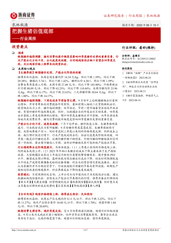 【浙商证券】【20230919】20230919-浙商证券-农林牧渔行业周报:把握生猪估值底部-17页