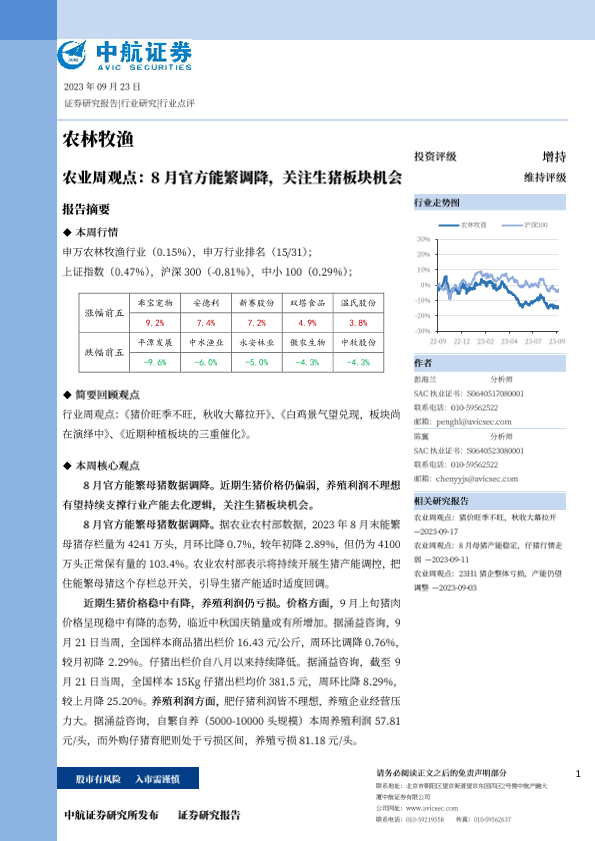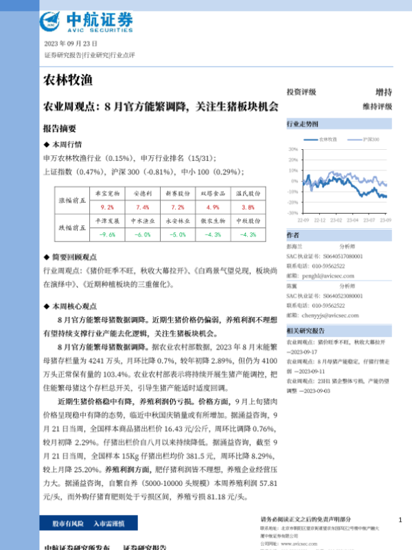 【中航证券】【20230923】农业周观点:8月官方能繁调降,关注生猪板块机会-14页