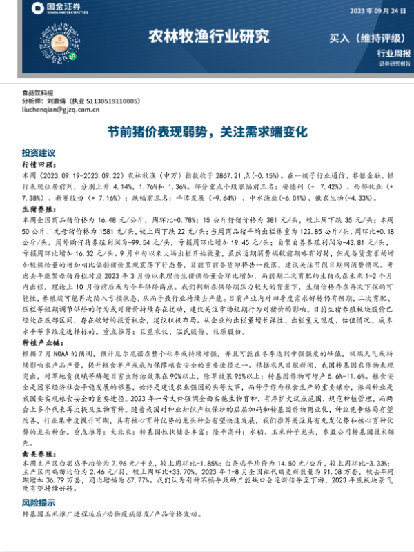 【国金证券】【20230924】20230924-国金证券-农林牧渔行业研究:节前猪价表现弱势,关注需求端变化-15页