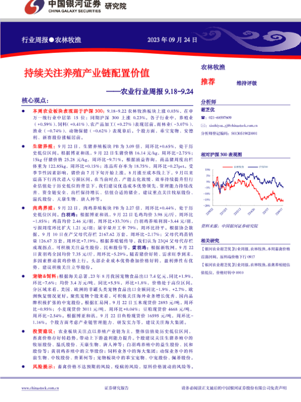 【银河证券】【20230924】农业行业周报:持续关注养殖产业链配置价值-15页