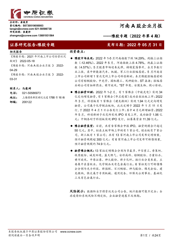 【中原证券】【20220531】豫股专题(2022年第4期):河南A股企业月报-24页
