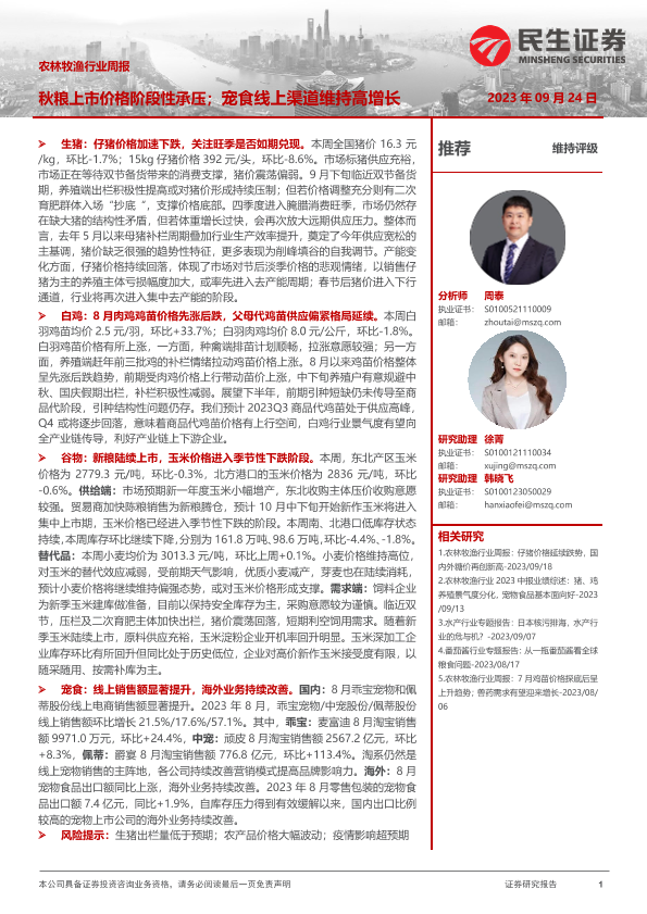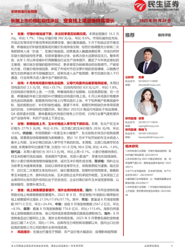 【民生证券】【20230924】20230924-民生证券-农林牧渔行业周报:秋粮上市价格阶段性承压;宠食线上渠道维持高增长-17页