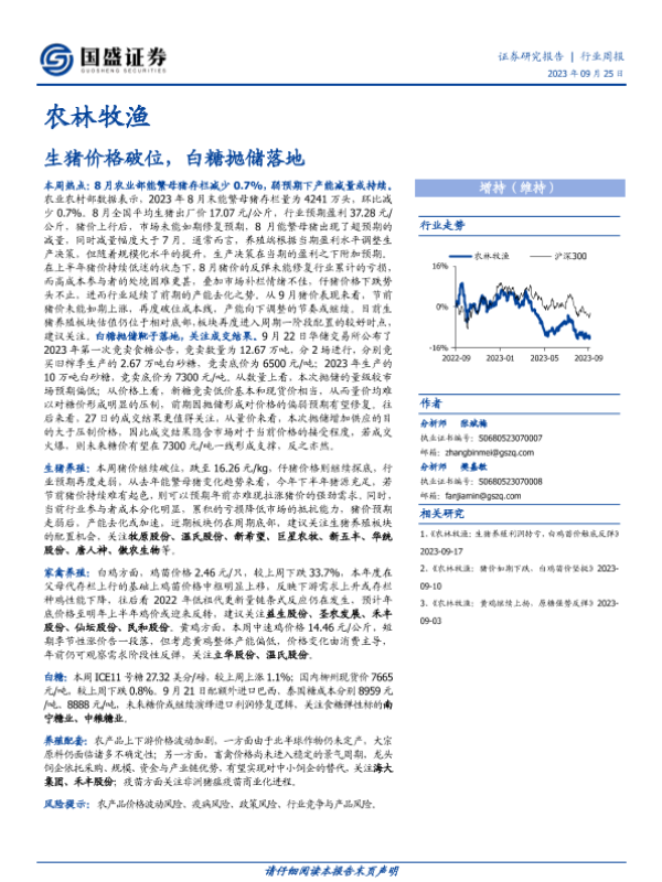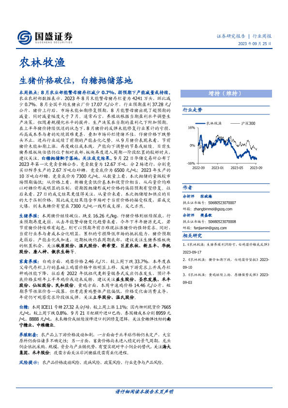 【国盛证券】【20230925】20230925-国盛证券-农林牧渔行业周报:生猪价格破位,白糖抛储落地-12页