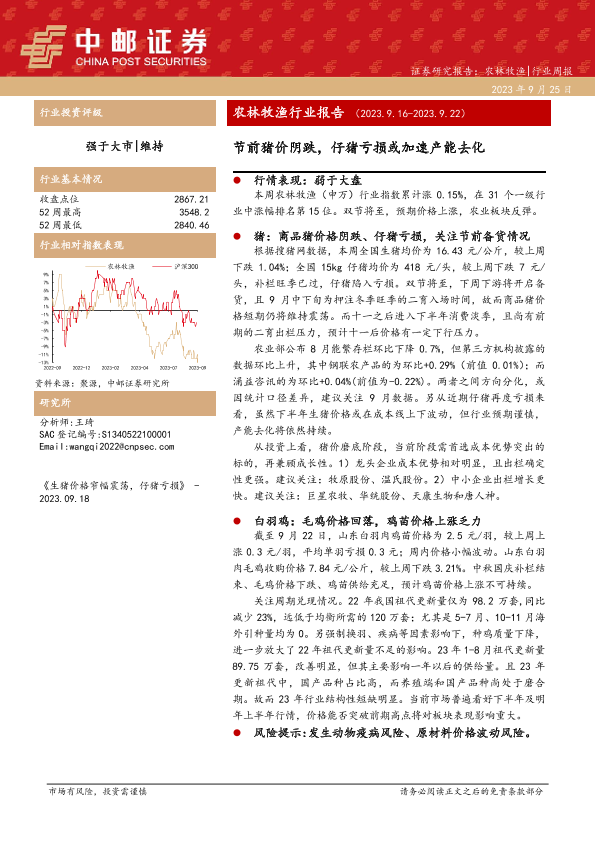 【中邮证券】【20230925】20230925-中邮证券-农林牧渔行业报告:节前猪价阴跌,仔猪亏损或加速产能去化-12页