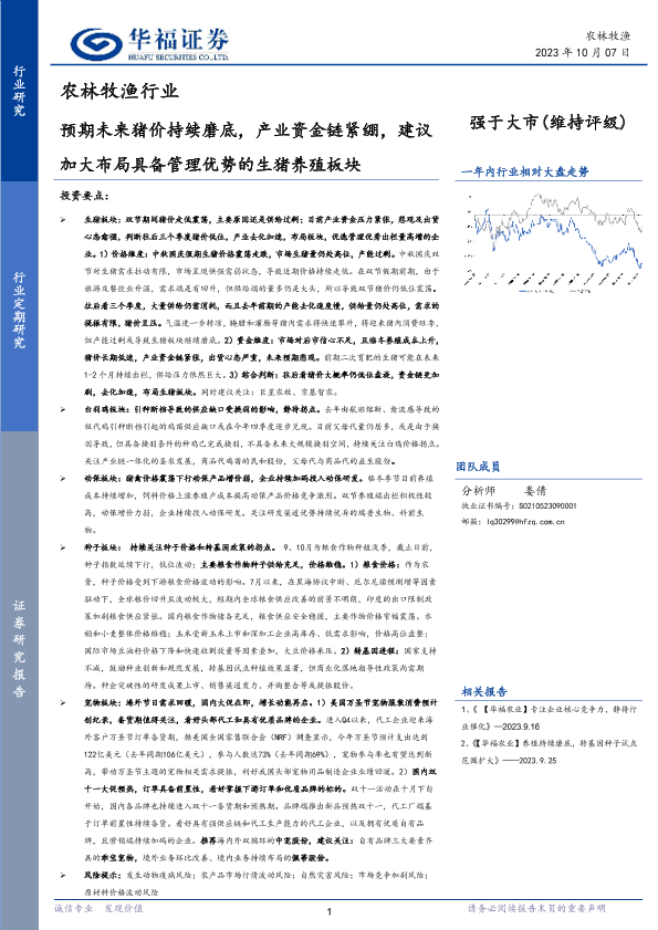 【华福证券】【20231007】农林牧渔行业:预期未来猪价持续磨底,产业资金链紧绷,建议加大布局具备管理优势的生猪养殖板块-14页