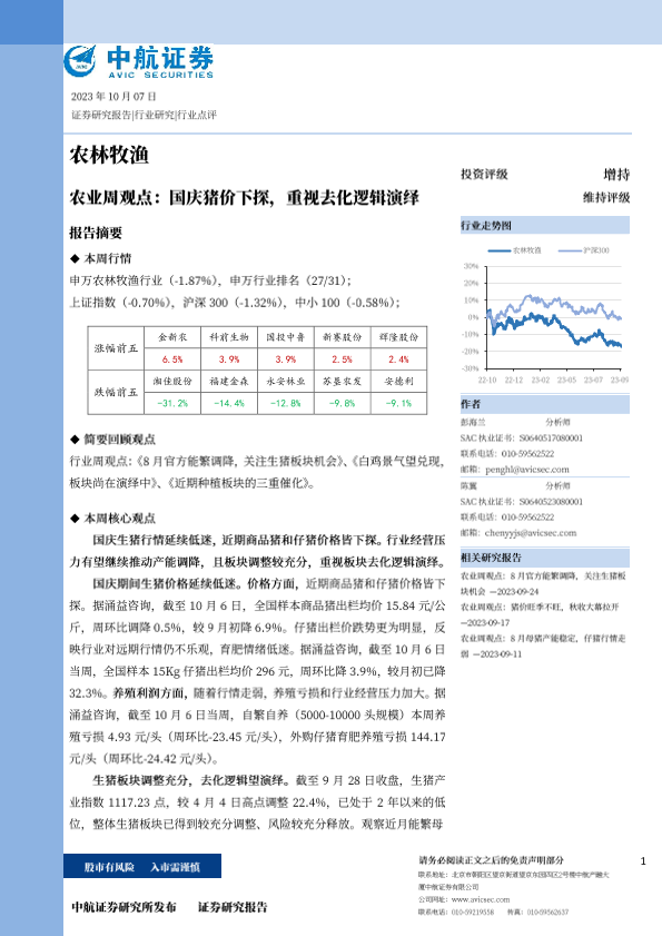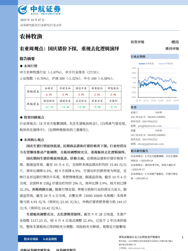 【中航证券】【20231007】农业周观点:国庆猪价下探,重视去化逻辑演绎-14页