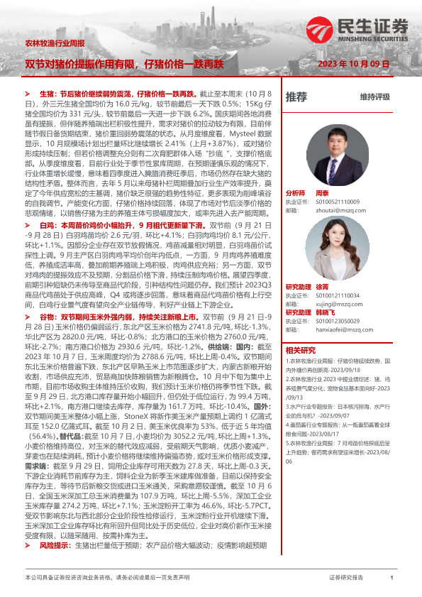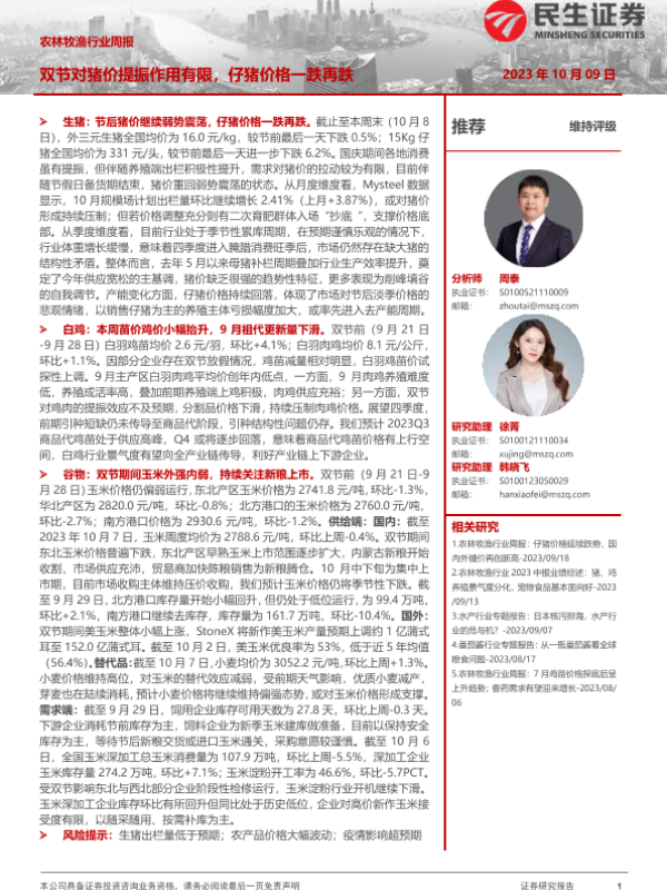 【民生证券】【20231009】农林牧渔行业周报:双节对猪价提振作用有限,仔猪价格一跌再跌-15页
