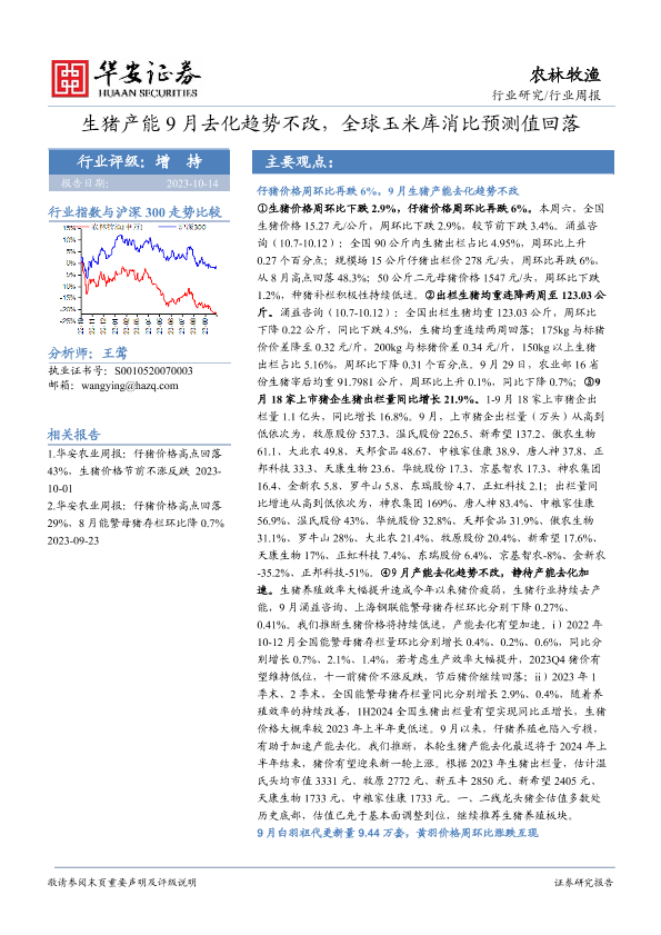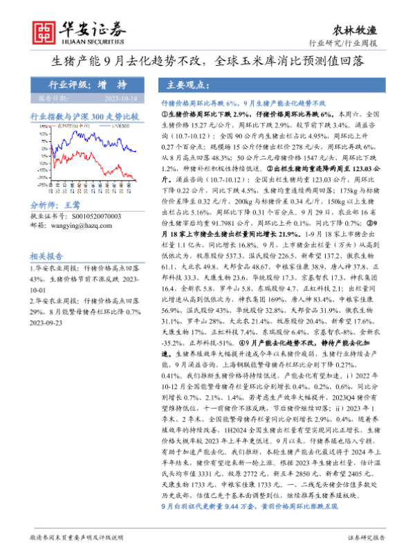 【华安证券】【20231014】20231014-华安证券-农林牧渔行业周报:生猪产能9月去化趋势不改,全球玉米库消比预测值回落-37页