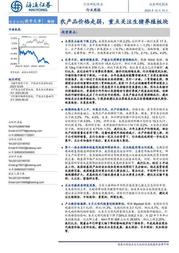 【海通证券】【20231015】20231015-海通证券-农业行业周报:农产品价格走弱,重点关注生猪养殖板块-11页