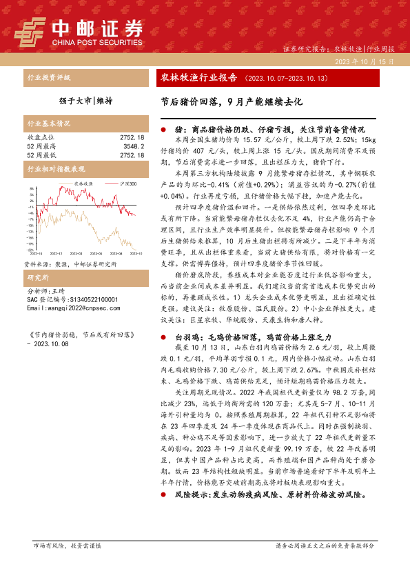 【中邮证券】【20231015】20231015-中邮证券-农林牧渔行业周报:节后猪价回落,9月产能继续去化-12页