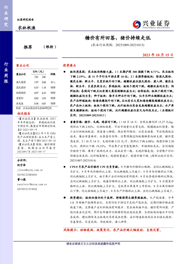 【兴业证券】【20231015】糖价有所回落,猪价持续走低-16页