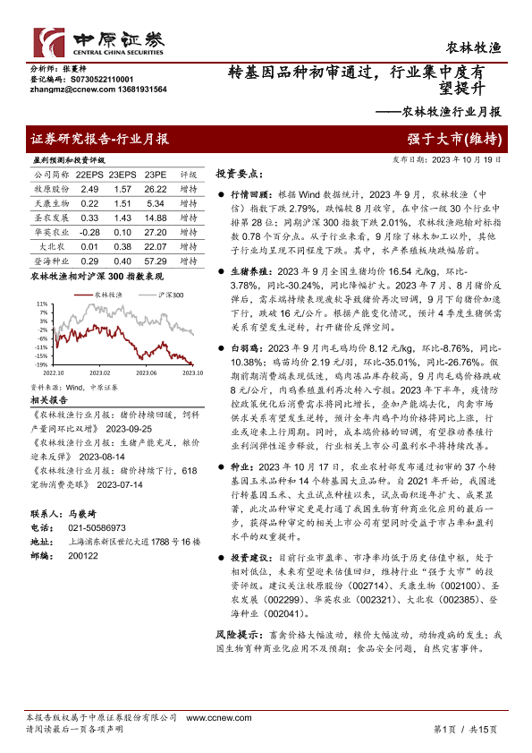 【中原证券】【20231019】20231019-中原证券-农林牧渔行业月报:转基因品种初审通过,行业集中度有望提升-15页