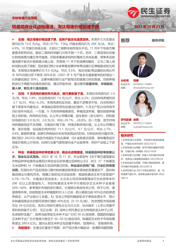 【民生证券】【20231023】20231023-民生证券-农林牧渔行业周报:转基因商业化进程提速;淘汰母猪价格加速下跌-15页