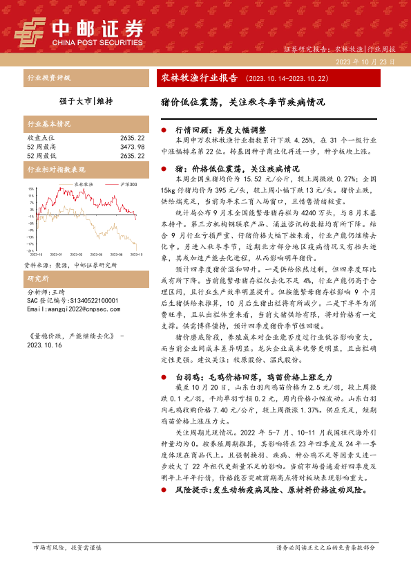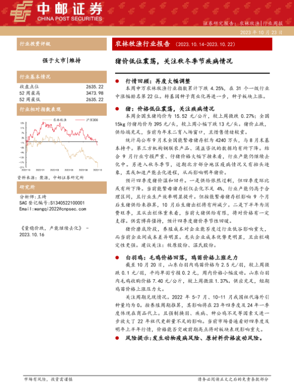 【中邮证券】【20231023】20231023-中邮证券-农林牧渔行业报告:猪价低位震荡,关注秋冬季节疾病情况-12页