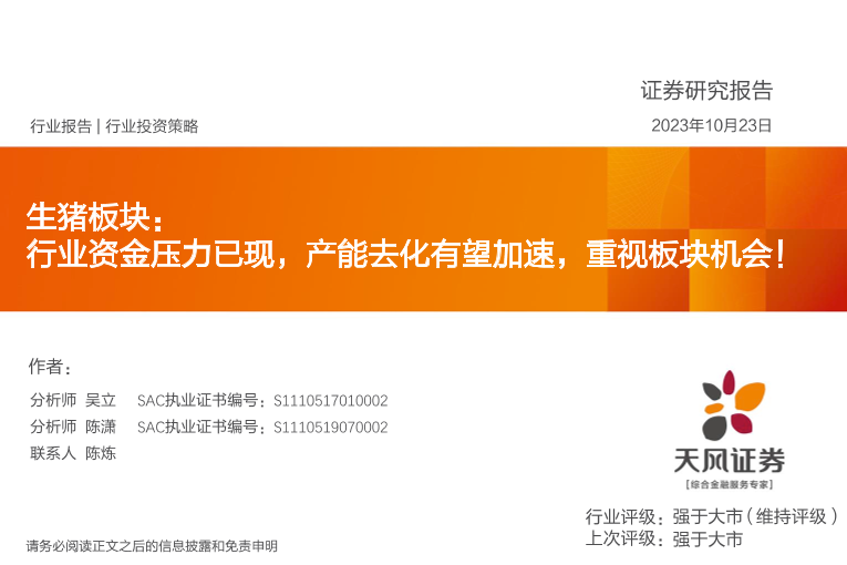 【天风证券】【20231023】生猪板块:行业资金压力已现,产能去化有望加速,重视板块机会!-20页