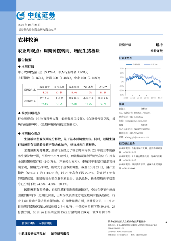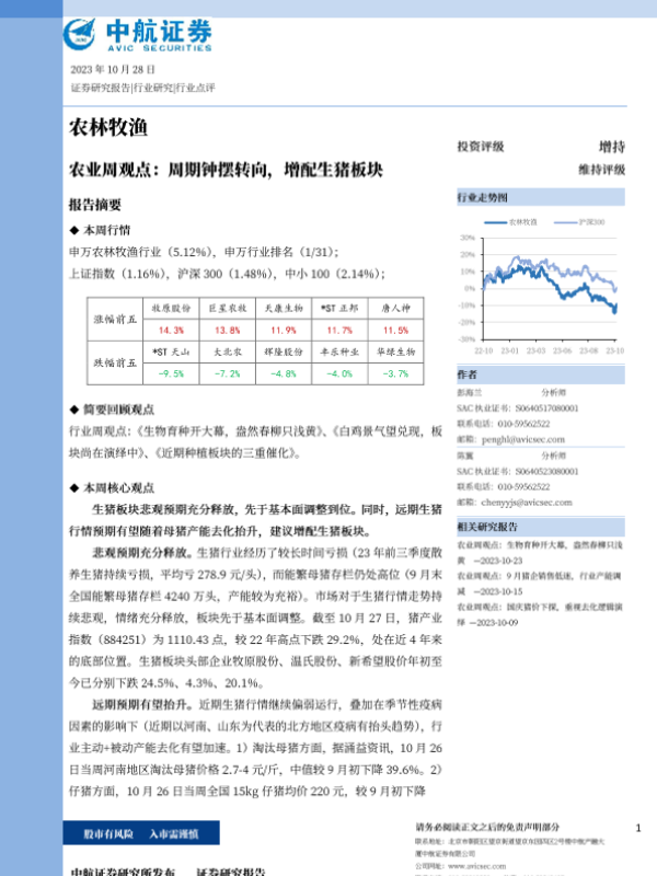 【中航证券】【20231028】农林牧渔行业周观点:周期钟摆转向,增配生猪板块-13页