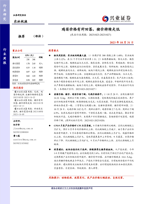 【兴业证券】【20231031】鸡苗价格有所回落,猪价持续走低-16页