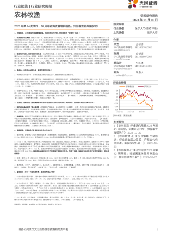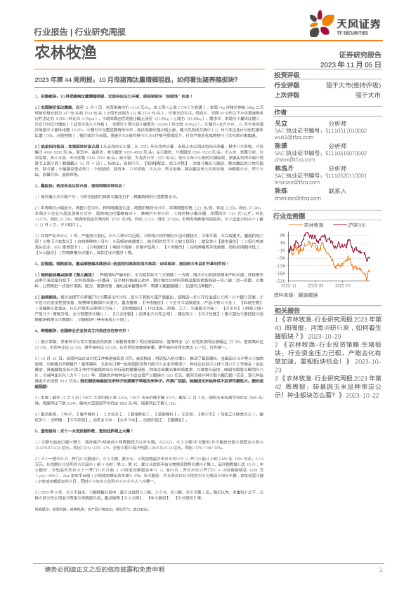 【天风证券】【20231105】农林牧渔2023年第44周周报:10月母猪淘汰量增幅明显,如何看生猪养殖板块?-14页