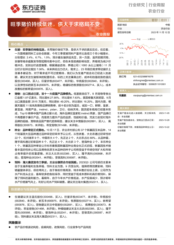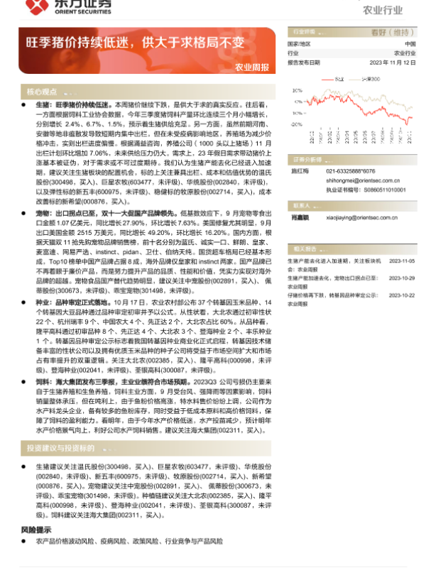 【东方证券】【20231112】20231112-东方证券-农业周报:旺季猪价持续低迷,供大于求格局不变-12页