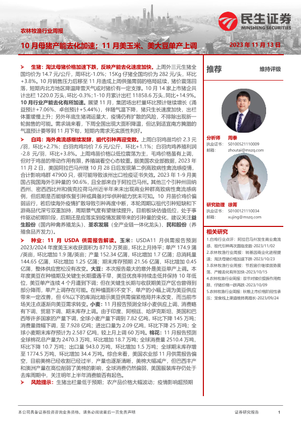 【民生证券】【20231113】20231113-民生证券-农林牧渔行业周报:10月母猪产能去化加速;11月美玉米、美大豆单产上调-14页
